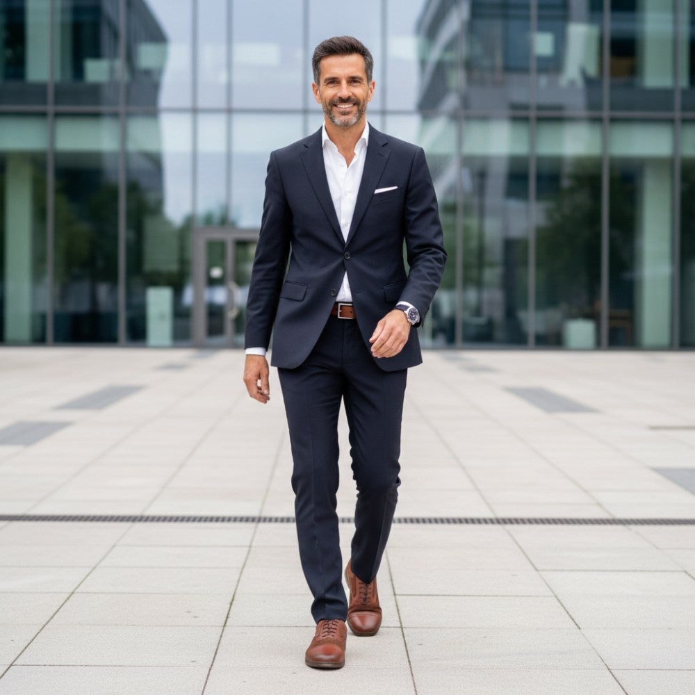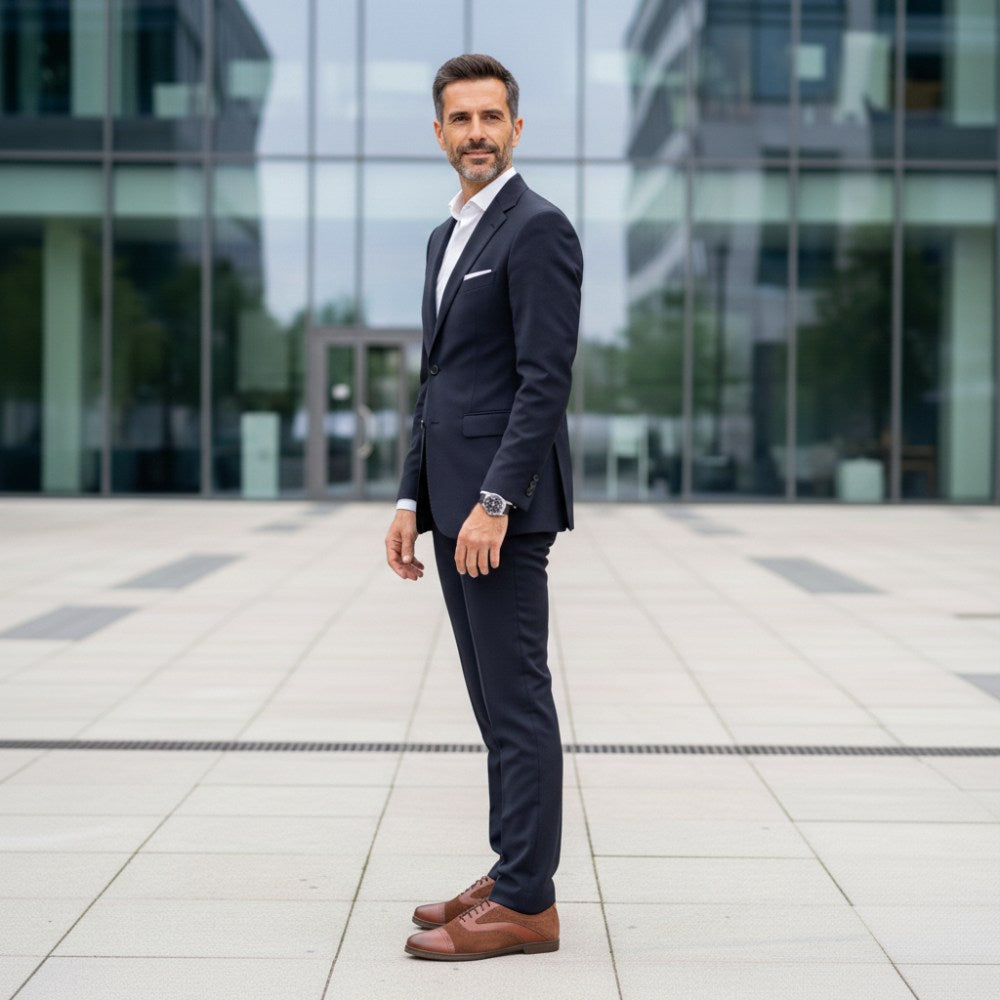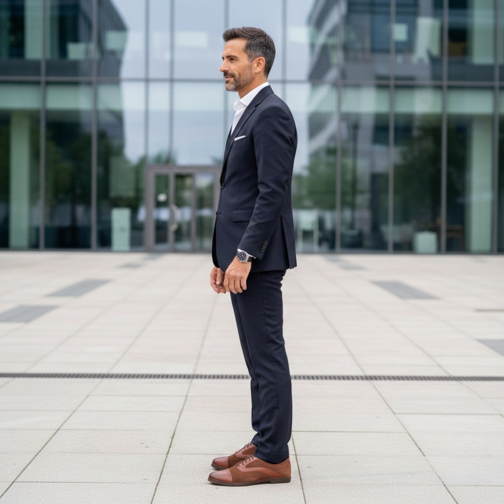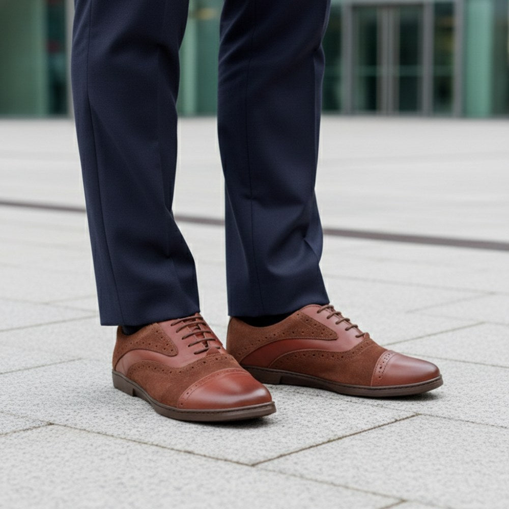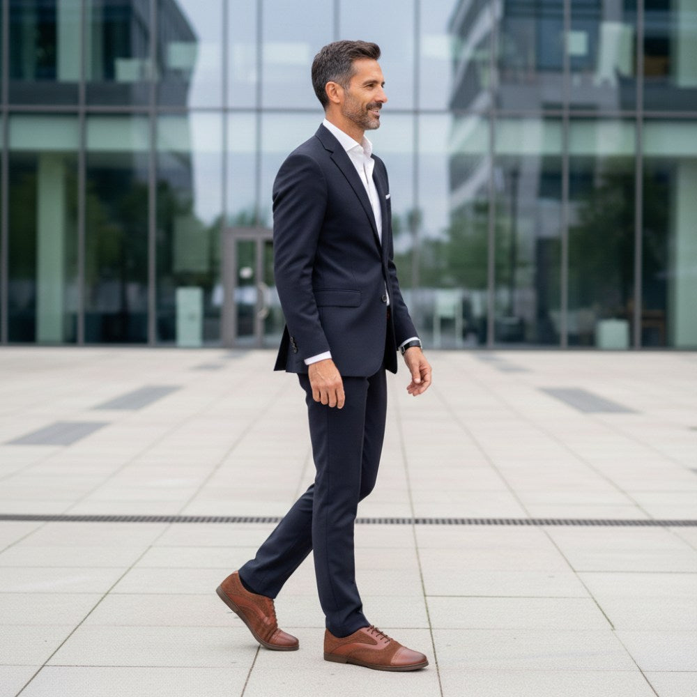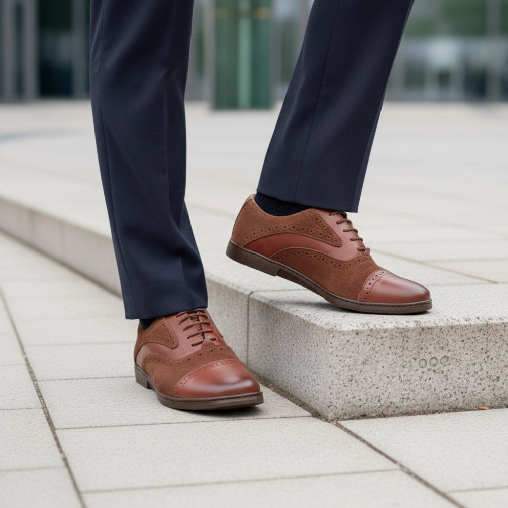 Con su cálido tono marrón, este zapato descalzo simplemente se ve elegante y se adapta perfectamente a los pantalones del traje. Para Qentle usamos cuero Nappa de alta calidad en combinación con gamuza premium. A lo largo de las costuras, actualizamos el zapato con broteos finos y enfatizamos las líneas del zapato descalzo para estirarlo visualmente.