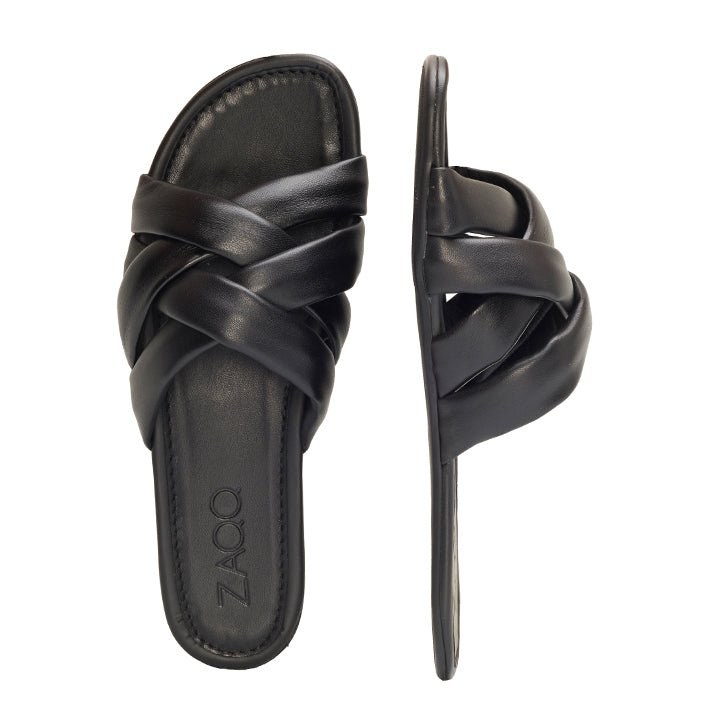 This slip sandal works with the braided strap feminine and is so comfortable that every step becomes a pleasure. On the beach promenade or through the City, AlaQ is there!