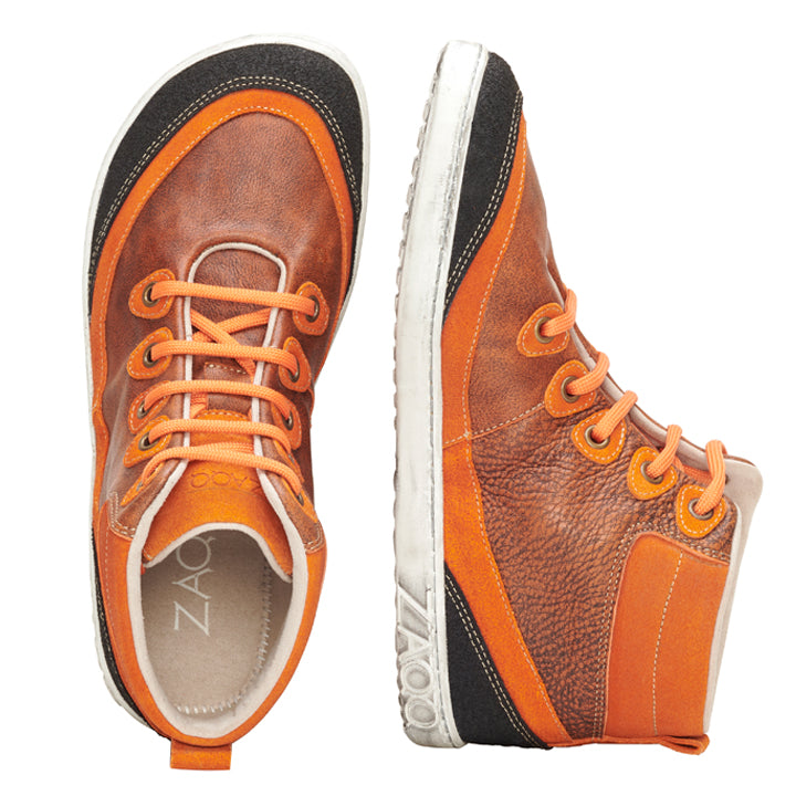 This mid-cut barefoot shoe inspires with its modern look and definitely stands out from the crowd. The striking orange is an exciting symbiosis with the earthy brown tone. Fine details such as the hand -sewn patches on the laces give our cinco a cheeky look.