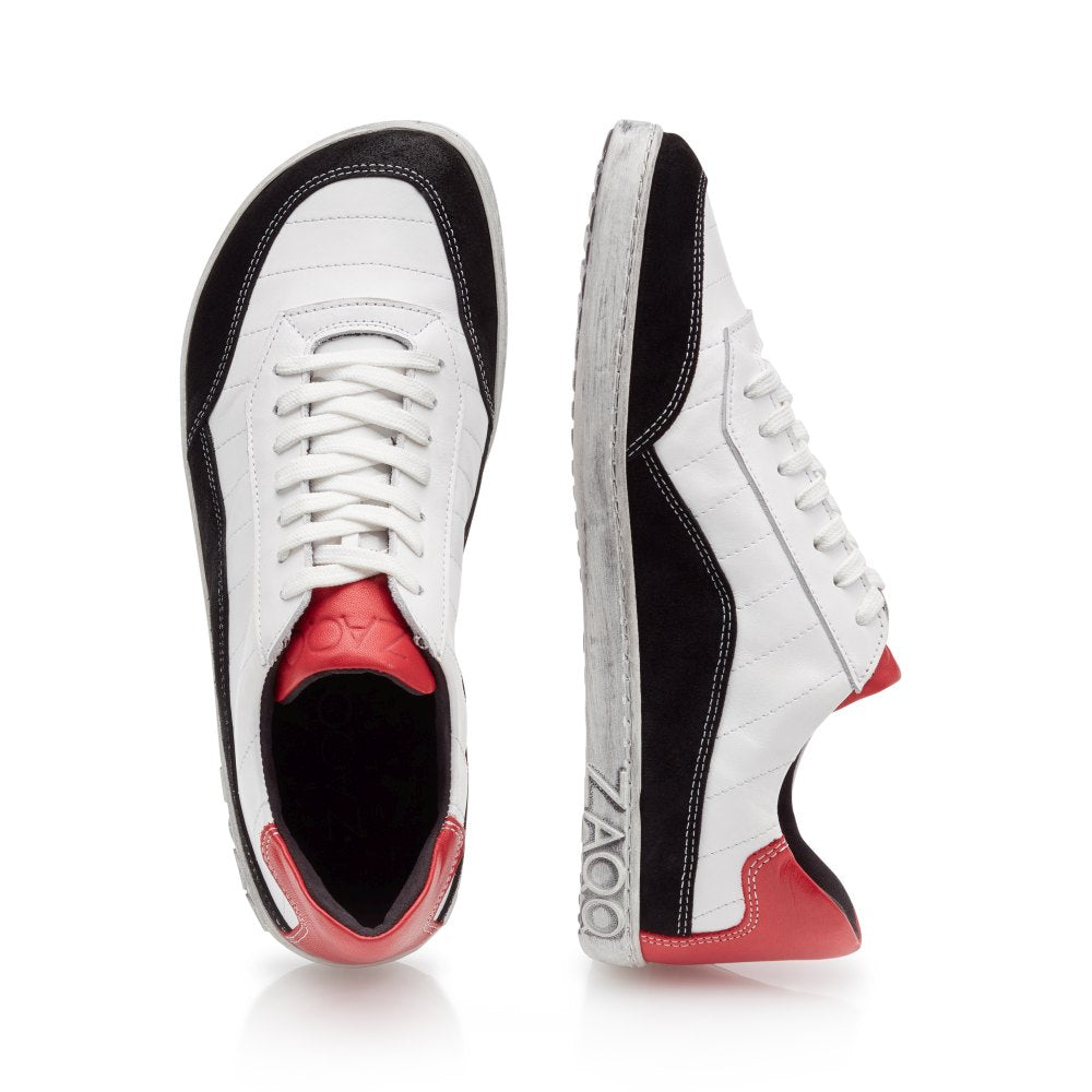 With the color mix of white, subtle red and black, the barefoot sneaker looks fresh and modern. The transverse decorative stitching gives the Qampion one more detail and loosen up the design. We broke the white barefoot sole from rubber in black to give the sneaker more nonchalance.