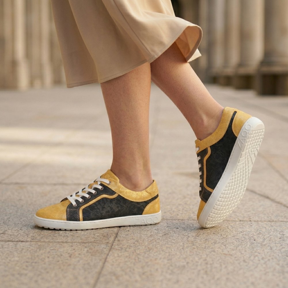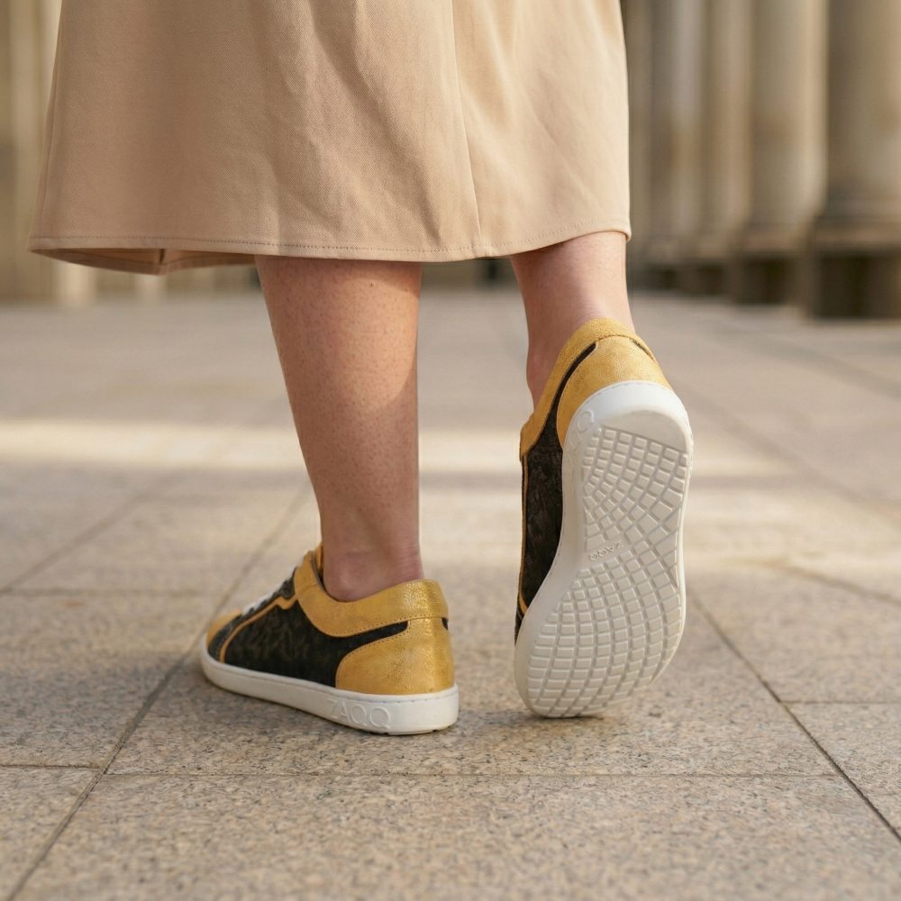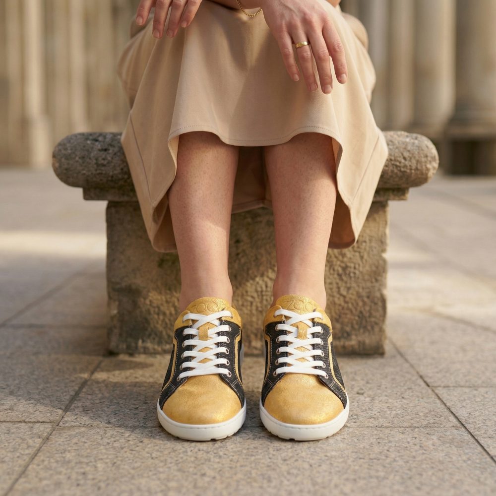 Qody Gold is not only visually an eye -catcher, but also convinces with the highest comfort. The shoe, which is very wide, especially in the front area, leaves your toes a lot of freedom of movement. Nevertheless, Qody looks sleek, because the black -off areas looks much narrower than it is actually. The highly flexible barefoot sole, which gives you support and slip resistance at the same time, ensures a blessing with every step. In order to do justice to the modern design of the shoe, we have broken the sole by hand.