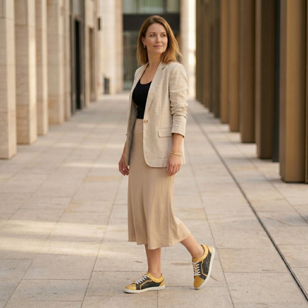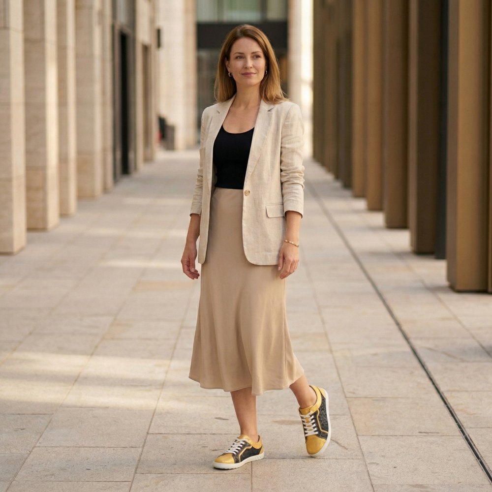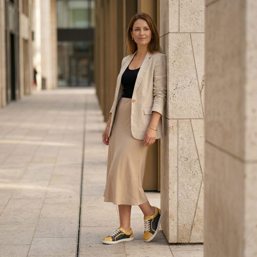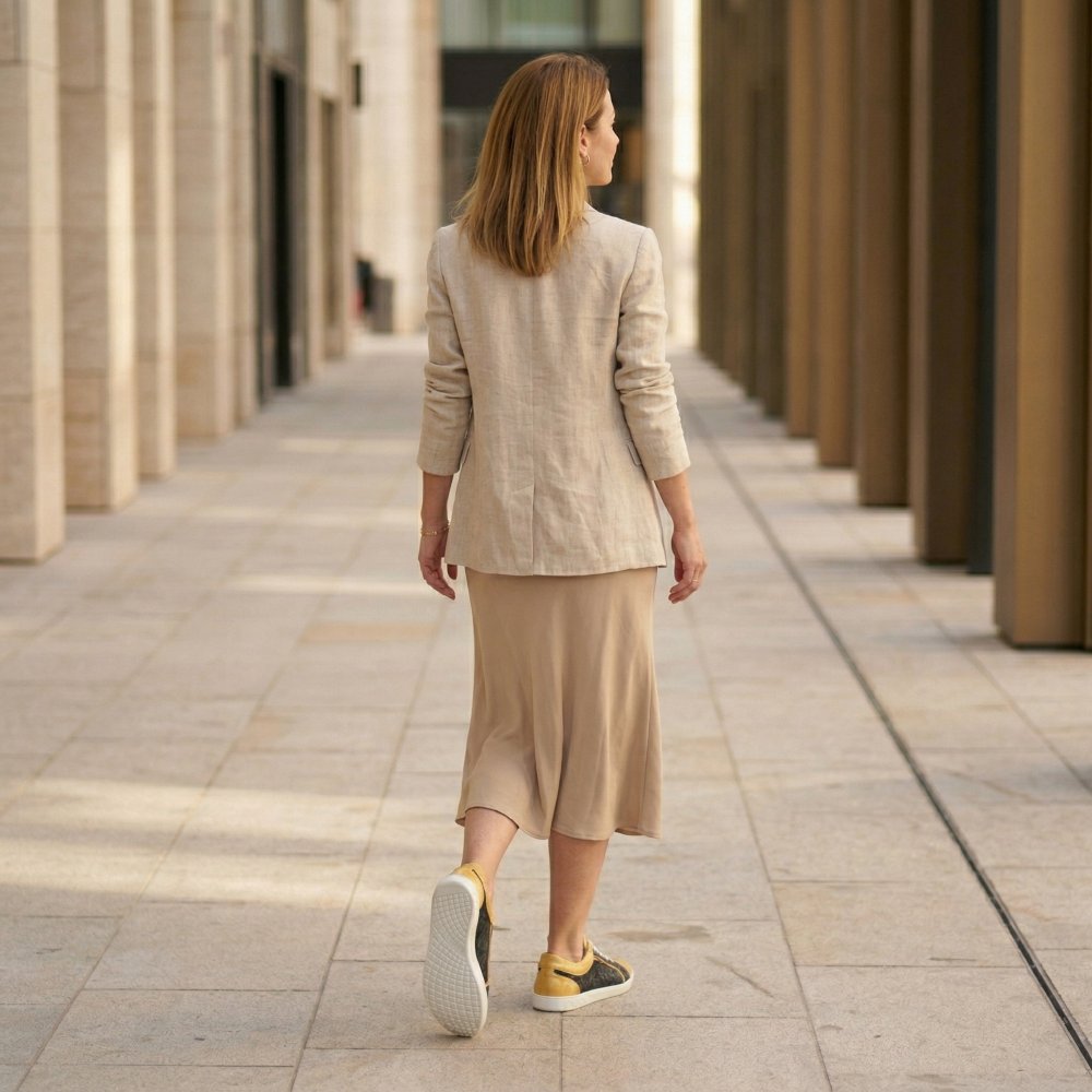 Qody Gold is not only visually an eye -catcher, but also convinces with the highest comfort. The shoe, which is very wide, especially in the front area, leaves your toes a lot of freedom of movement. Nevertheless, Qody looks sleek, because the black -off areas looks much narrower than it is actually. The highly flexible barefoot sole, which gives you support and slip resistance at the same time, ensures a blessing with every step. In order to do justice to the modern design of the shoe, we have broken the sole by hand.