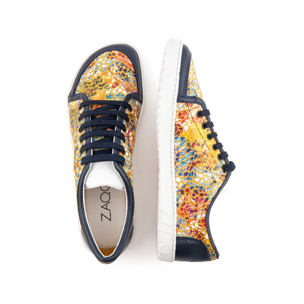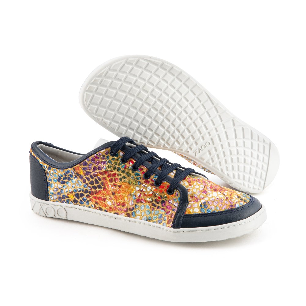 Made of high -quality nappa leather with a colorful flower pattern and offset details in dark blue, this barefoot shoe is an absolute eye -catcher! But this sneaker is also phenomenal for your feet - it offers a lot of space for the toes and at the same time safe hold on the ankles.